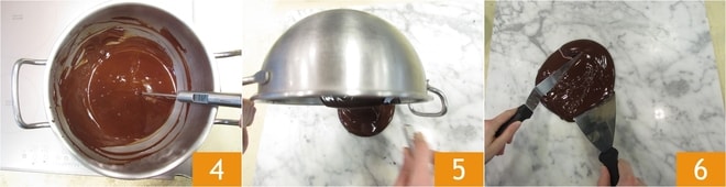 Verwenden Sie ein Thermometer, um zu überprüfen, ob die Schokolade eine Temperatur zwischen 50 und 55°C erreicht hat 4. Trocknen Sie dann den Boden der Metallschüssel sorgfältig ab und geben Sie die Schokolade auf den sauberen und perfekt trockenen Marmor 5. Mit Hilfe von zwei Spachteln schieben Sie die Schokolade auf dem Marmor hin und her 6, verteilen und sammeln sie erneut, um die Kakaobutter abzukühlen.