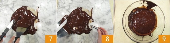 Sie werden feststellen, dass die Schokolade nach und nach glänzend und dickflüssiger wird 7. Messen Sie regelmäßig die Temperatur 8 und sobald sie 29°C erreicht hat, geben Sie sie mit den beiden Spachteln in eine Schüssel 9.