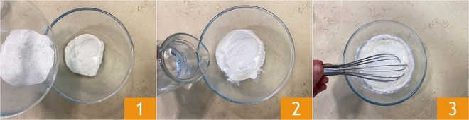 Um die Garnelen in Tempura zuzubereiten, bereitet zuerst den Teig vor: In einer Schüssel das Reismehl und das Weizenmehl 00 vereinen 1, dann das kalte Sprudelwasser hinzufügen 2 und gut mit einem Schneebesen verrühren um die Bildung von Klumpen zu vermeiden 3.