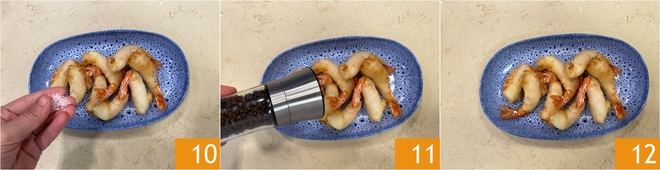 Mit Salz 10 und Pfeffer nach Belieben würzen 11 und die Garnelen in Tempura sofort servieren 12!