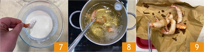 Nach der Ruhezeit seid ihr bereit zum Frittieren: Erhitzt das Pflanzenöl auf 170°-180° und taucht jede Garnele in den Teig, indem ihr sie am Schwanz haltet 7. Die Garnelen in das auf Temperatur gebrachte Öl tauchen und für 1-2 Minuten frittieren 7; der Teig sollte nicht färben, sondern hell bleiben. Die Garnelen auf saugfähigem Papier oder für Frittiertes abtropfen lassen um überschüssiges Öl zu entfernen 9.