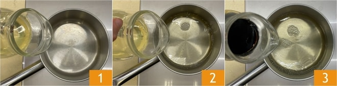 Um die Teriyaki-Sauce zuzubereiten, geben Sie Sake 1, Mirin 2 und Sojasauce 3 in einen kleinen Topf.