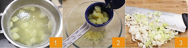 Um die Terrine Millegeschmack zuzubereiten, schälen und schneiden Sie die Kartoffeln grob, dann kochen Sie sie in reichlich gesalzenem Wasser für etwa 15 Minuten 1. Drücken Sie sie in eine Kartoffelpresse (oder Passiermühle), sodass das Püree direkt in eine Schüssel fällt, und lassen Sie es abkühlen 2. Putzen, waschen und schneiden Sie die Frühlingszwiebel in feine Scheiben 3, dann lassen Sie sie mit wenig Öl bei niedriger Hitze für mindestens 15 Minuten schmoren.