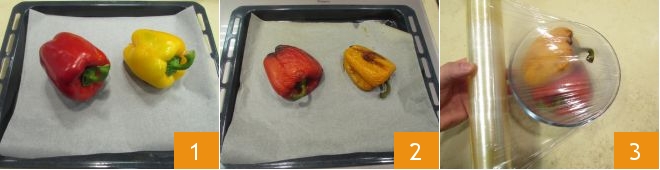 Um die Thunfisch- und Ricotta-Frikadellen mit Paprika zuzubereiten, beginnen Sie damit, die beiden Paprikaschoten zu waschen und zu trocknen 1; legen Sie sie dann auf ein Backblech und backen Sie sie bei 250°C etwa 30-40 Minuten, wobei Sie sie gelegentlich wenden, bis die Haut gut geröstet ist 2. Sobald sie geröstet sind, legen Sie sie für etwa 15 Minuten in einen Plastikbeutel oder in eine Schüssel, die mit Frischhaltefolie abgedeckt ist 3.