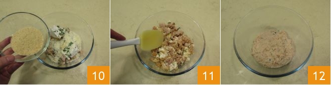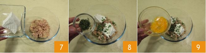 In der Zwischenzeit bereiten Sie den Teig für die Frikadellen vor: Geben Sie den Thunfisch in eine Schüssel, fügen Sie den Ricotta hinzu 7, den gehackten Thymian und Majoran 8 und das zuvor geschlagene Ei 9.