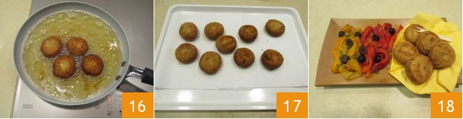 Braten Sie sie etwa 6 Minuten lang, bis sie auf beiden Seiten goldbraun sind 16. Lassen Sie die Frikadellen auf Küchenpapier abtropfen 17 und servieren Sie sie noch heiß mit den Paprika 18.