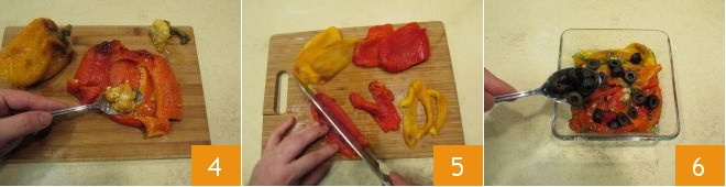 Nach der angegebenen Zeit nehmen Sie die Paprikaschoten aus dem Beutel und entfernen Sie die Haut, die sich ziemlich leicht ablösen lässt. Sobald sie geschält sind, entfernen Sie die Samen und die inneren Fasern der Paprikaschoten 4, und schneiden Sie sie dann in Streifen 5. Geben Sie die Paprikastreifen in eine Schüssel und würzen Sie sie mit gehacktem Thymian, Salz, zerdrücktem Knoblauch, nativem Olivenöl extra und schließlich den entkernten und in Scheiben geschnittenen schwarzen Oliven 6. Mischen Sie die Zutaten und lassen Sie alles ruhen.