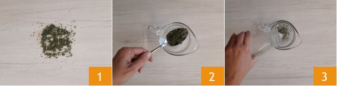 Um das Thymianbrot mit Sauerteig zuzubereiten, beginne mit der Zubereitung der Thymianinfusion, die du auch am Vortag machen kannst. Putze den Thymian, indem du mit den Fingern über die Zweige fährst, um nur die Blätter zu erhalten 1. Bringe 350 g Wasser zum Kochen; nimm einen Krug und gib zwei Esslöffel frischen Thymian hinein 2, dann füge das kochende Wasser hinzu 3.