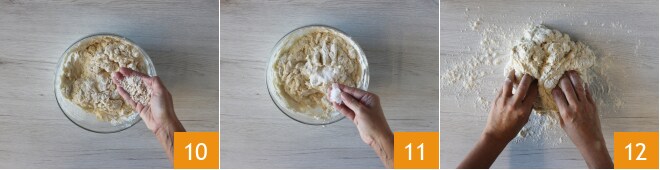 Füge das Malzpulver 10 und das feine Salz hinzu 11. Kippe den Teig auf eine bemehlte Fläche und knete ihn mit den Händen 12