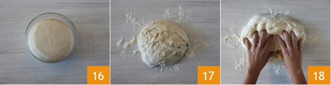 und lasse ihn auf das Doppelte aufgehen 16. Dies dauert ca. 5 Stunden. Nach der Ruhezeit den Teig auf die bemehlte Fläche kippen 17 und vorsichtig mit den Händen entgasen und versuchen, ihm eine rechteckige Form zu geben 18.
