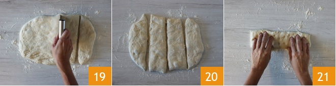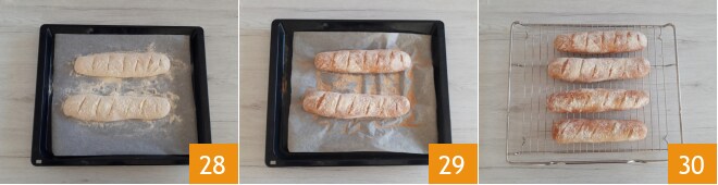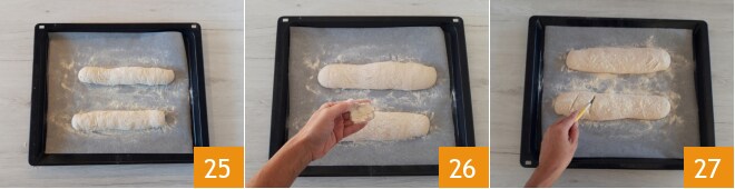 Lege die Brote auf ein mit Backpapier ausgelegtes Blech, mit der Naht nach unten 25. Lass die Brote bis zur Verdopplung aufgehen. Dies dauert ca. 2 Stunden. Bestreue die Brote mit Hartweizengrieß 26 und schneide die Oberfläche ein 27,
