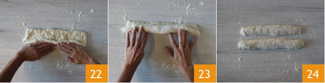 und forme die Brote: Beginne, indem du das Rechteck von der langen Seite nach außen schließt 22 und rolle es bis zum vollständigen Verschluss 23 24.