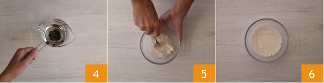 Lasse die Thymianinfusion vollständig abkühlen und filtere sie dann mit einem Sieb 4. Zerkleinere den aufgefrischten Sauerteig in einer Schüssel, füge 50 g Wasser hinzu und rühre 5, bis er sich vollständig aufgelöst hat 6.