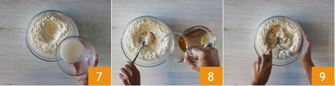 Gib das Mehl in eine Schüssel und füge den aufgelösten Sauerteig hinzu 7. Gib die Thymianinfusion nach und nach hinzu und rühre mit einem Löffel 8 9.