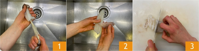 Um den Tintenfisch-Kartoffelsalat zuzubereiten, beginnen Sie mit der Reinigung der Tintenfische: Trennen Sie vorsichtig den Kopf vom Körper 1, entfernen Sie die Innereien und die transparente Schale, ziehen Sie die äußere Haut und die seitlichen Flossen ab 2. Schneiden Sie den Schnabelteil ab und spülen Sie die Tintenfische gut unter fließendem Wasser ab, dann schneiden Sie sie in Ringe 3. Schneiden Sie auch den Teil mit den Tentakeln in Stücke.