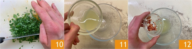 Hacke Sie dann auch die Petersilie fein 10. Bereiten Sie in einer kleinen Schüssel die Zitronensoße vor: Geben Sie den Zitronensaft dazu 11 und fügen Sie die Knoblauch- und Chilimischung hinzu 12.