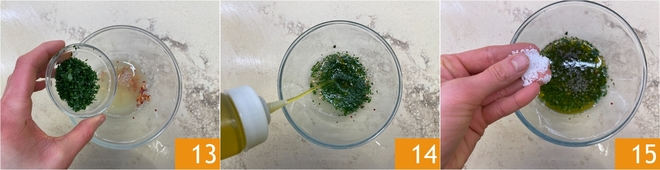 Fügen Sie dann hinzu: gehackte Petersilie 13, Öl 14, Salz 15 und gemahlenen Pfeffer.