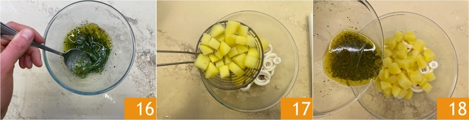 Mischen Sie, um die Sauce gut zu emulgieren 16. Sobald die Kartoffeln gekocht sind, lassen Sie sie gut abtropfen und geben Sie sie in die Schüssel mit den Tintenfischen 17. Geben Sie dann auch die Zitronensoße hinzu 18.