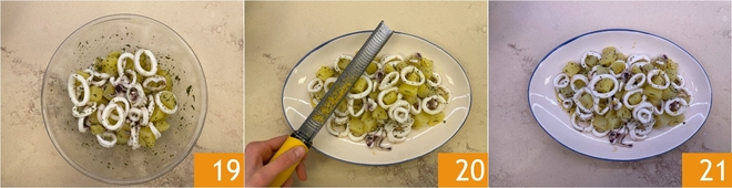 Mischen Sie alles gut durch, um es zu würzen 19, dann anrichten und mit geriebener Zitronenschale garnieren 20. Der Tintenfisch-Kartoffelsalat ist servierfertig 21.