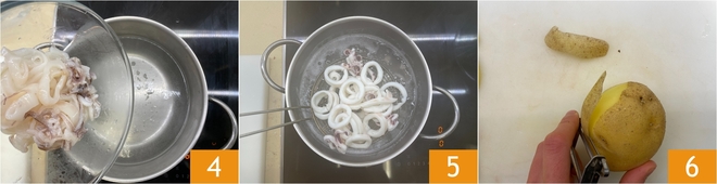 Bringen Sie einen Topf mit leicht gesalzenem Wasser zum Kochen, tauchen Sie die Tintenfische ein 4 und kochen Sie sie etwa 3 Minuten, dann gut abtropfen lassen 5 und in einer Schüssel beiseite stellen. In der Zwischenzeit schälen Sie die Kartoffeln 6.