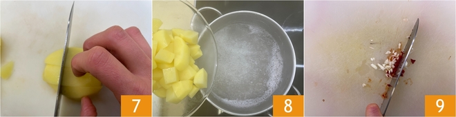 Schneiden Sie sie in 3 cm große Würfel 7 und geben Sie sie in dasselbe Kochwasser der Tintenfische 8. Kochen Sie sie 10 Minuten oder bis sie zart, aber noch fest sind, dann abtropfen lassen und abkühlen lassen. Bereiten Sie nun eine feine Mischung aus Knoblauch und Chili vor 9.