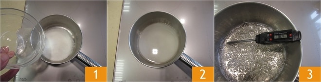 Um das traditionelle Tiramisù zuzubereiten, stellen Sie zunächst die pâte à bombe her. In einem kleinen Topf 80 g Zucker mit 30 g Wasser 1 geben. Erhitzen Sie den Sirup bei schwacher Hitze 2 und kontrollieren Sie die Temperatur mit einem Küchenthermometer, bis sie 118° erreicht.