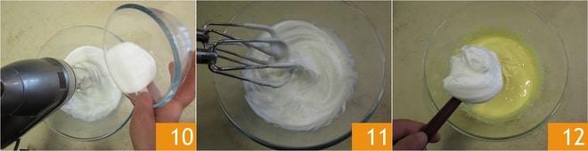 Sobald die Eiweiße weiß und schaumig sind, fügen Sie die verbleibenden 100 g Zucker hinzu 10 und schlagen Sie weiter, bis Sie eine feste und stabile Konsistenz erreichen 11. Fügen Sie ein Drittel der steif geschlagenen Eiweiße zur Eigelb-Mascarpone-Mischung hinzu und rühren Sie energisch mit dem Spatel 12.
