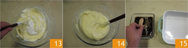 Fügen Sie die restlichen Eiweiße hinzu 13 und mischen Sie vorsichtig von oben nach unten, bis Sie eine homogene Creme erhalten 14. Tauchen Sie an diesem Punkt die Löffelbiskuits einzeln in den Kaffee bei Raumtemperatur 15.