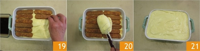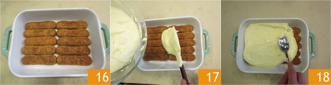 Legen Sie sie nacheinander in eine große Auflaufform 25x19 cm, ordentlich, um die gesamte Oberfläche zu bedecken 16. Gießen Sie nun die Hälfte der Creme darauf 17 und glätten Sie sie 18, um die Löffelbiskuits vollständig zu bedecken.