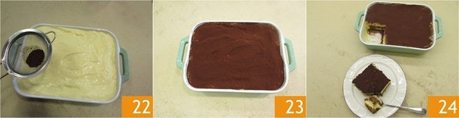 Zum Servieren bestreuen Sie das Tiramisù mit dem Kakaopulver 22, sodass es vollständig bedeckt ist 23. Das traditionelle Tiramisù ist bereit, geschnitten und genossen zu werden 24.