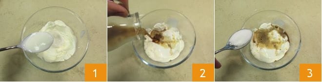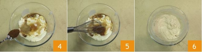Um das Tiramisu mit 5 Gewürzen vorzubereiten, beginnen Sie mit der Creme. In einer Schüssel den Mascarpone, den Joghurt 1, den Kaffee bei Raumtemperatur 2 hinzugeben und mit Zucker süßen 3.
