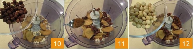 die Haselnüsse 10, die chinesische Gewürzmischung 11 und schließlich die Macadamianüsse 12 in den Mixer geben.