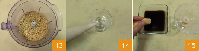 Den Mixer laufen lassen, bis eine krümelige und etwas grobe Mischung entstanden ist 13. Dann die Gläser bereitstellen und mit der Zusammenstellung beginnen. Etwas Creme auf den Boden des Glases drücken 14, dann die in 2 oder 3 Teile gebrochenen Löffelbiskuits kurz eintauchen 15;