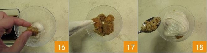 in das Glas geben 16, um eine Schicht zu schaffen, auf die weitere Creme hinzugefügt wird 17. Insgesamt 2 Löffelbiskuits pro Glas anordnen. Schließlich mit einem Löffel Crumble garnieren 18