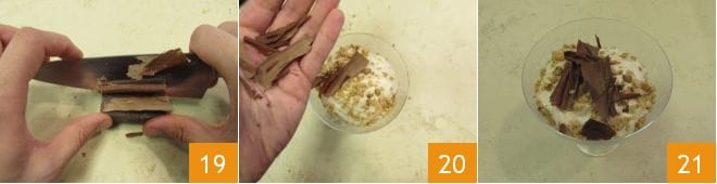 Und mit direkt vom Schokoladenblock abgeraspelten Schokoladenraspeln garnieren, mit Hilfe der Klinge 19. Dann auf der Oberfläche jedes Glases anordnen 20 und Ihr Tiramisu mit 5 Gewürzen ist bereit zum Genießen 21.