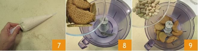 dann die Masse in einen Spritzbeutel ohne Tülle geben und kurz in den Gefrierschrank stellen 7. Weiter mit dem Crumble. Die Kekse 8, die Mandeln 9,