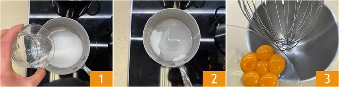 Um das Tiramisu mit Amaretti zuzubereiten, beginnen Sie mit dem Sirup: Geben Sie das Wasser in einen kleinen Topf zum Zucker 1, dann stellen Sie ihn auf die Hitze und lassen den Zucker vollständig schmelzen, ohne zu rühren 2; er sollte eine Temperatur von 121° C erreichen. In der Zwischenzeit die Eigelbe in die Schüssel der Küchenmaschine geben 3 und mit dem Schneebesen beginnen, sie aufzuschlagen.