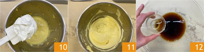 Die geschlagene Sahne nach und nach zur Mascarponecreme geben 10 und vorsichtig mit dem Teigschaber unterheben, dabei von unten nach oben ziehen, damit die Masse nicht zusammenfällt 11. Für die Tränke den Kaffee in eine große Schüssel gießen, dann den Likör hinzufügen und umrühren 12.