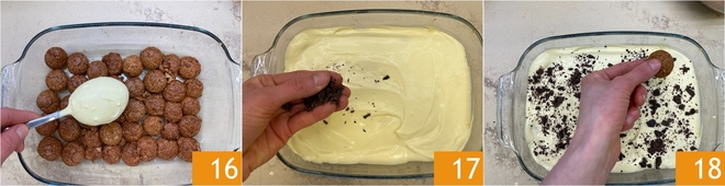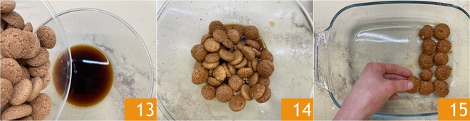 Geben Sie ein Drittel der Amaretti hinzu 13 und lassen Sie sie etwa eine Minute einweichen, dabei gut eingetaucht halten und vorsichtig wenden 14. Abtropfen lassen und ordentlich auf dem Boden der Auflaufform zu einer kompakten Schicht auslegen 15.