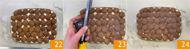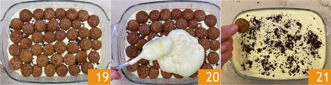 Setzen Sie sie dicht nebeneinander, sodass eine kompakte Schicht entsteht 19. Mit der restlichen Hälfte der Creme abdecken und die Oberfläche glattstreichen 20. Weitere 25 g gehackte Schokolade darüberstreuen 21, dann mit dem letzten Drittel der Amaretti abschließen, die Sie ebenfalls etwa eine Minute in der Kaffee-Tränke eingeweicht haben.
