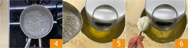 Wenn der Sirup die richtige Temperatur erreicht hat, bilden sich die typischen Bläschen 4. Gießen Sie ihn dann in dünnem Strahl auf die Eigelbe, während die Maschine bei niedriger Geschwindigkeit läuft 5, und achten Sie darauf, nicht direkt auf den Schneebesen zu zielen. Sobald der gesamte Sirup eingearbeitet ist, die Geschwindigkeit erhöhen und mindestens 5 Minuten weiterschlagen, bis die Masse hell, luftig und glänzend ist. Geben Sie dann den Mascarpone esslöffelweise dazu 6.