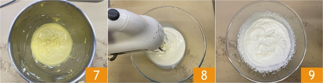 Weiter in der Küchenmaschine rühren, bis eine glatte und homogene Creme entsteht 7. Die Sahne separat mit dem Handmixer steif schlagen 8, bis sie eine gut feste Konsistenz hat 9.