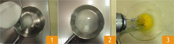 Um das Tiramisù mit pasteurisierten Eiern zuzubereiten, beginnt ihr mit der Pâte à bombe. Gebt das Wasser und den Zucker 1 in einen kleinen Topf. Erhitzt es bei niedriger Flamme ohne zu rühren 2 und kocht den Sirup, bis er eine Temperatur von 121 °C erreicht hat; verwendet ein Küchenthermometer, um die genaue Temperatur zu messen. Wenn ihr 115 °C erreicht habt, beginnt ihr, die Eigelbe in einer separaten Schüssel mit einem elektrischen Mixer zu schlagen 3.