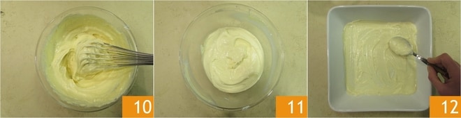 Ihr solltet eine gleichmäßige und feste Creme erhalten 10. Stellt sie in den Kühlschrank, während ihr den Kaffee zubereitet und abkühlen lasst 11. Nehmt jetzt eine quadratische Auflaufform von 20 cm an der Basis und 24 cm oben. Verteilt eine Schicht Mascarponecreme auf dem Boden 12.