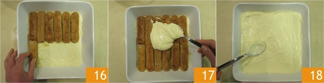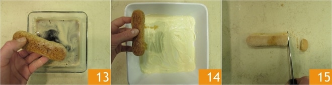 Tunkt die Löffelbiskuits schnell in den kalten Kaffee, einen nach dem anderen 13. Legt sie nach und nach in die Form 14, sodass ihr die erste Reihe vervollständigt; ihr benötigt 14 Stück. Schneidet sie leicht zu, falls nötig 15, damit ihr sie problemlos in die Form einsetzen könnt.