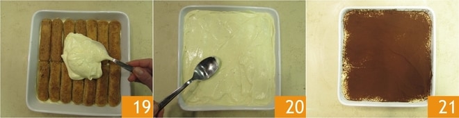 Verfahrt auf die gleiche Weise, um eine weitere Schicht Löffelbiskuits herzustellen, in unserem Fall muss die Form nicht zugeschnitten werden, da sie breiter ist. Abschließend bedeckt ihr mit der restlichen Creme 19 und glättet sie 20. Bestäubt die Oberfläche mit Kakao 21 und stellt das Tiramisù mit pasteurisierten Eiern für mindestens eine Stunde in den Kühlschrank, bevor ihr es serviert!