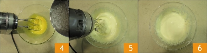 Sobald der Sirup 121 °C erreicht hat, gießt ihn langsam in zwei Schritten in die Eigelbe 4, während ihr weiter mixt 5. Achtet darauf, den Sirup nicht direkt auf die Rührer zu gießen, da er sonst an die Schüsselwand spritzt. Ihr müsst weiter rühren, bis ihr eine helle und schaumige Creme erhaltet; dies dauert etwa 10–15 Minuten, die Zeit kann je nach Leistung eures Mixers variieren. Die Mischung sollte auf Raumtemperatur abgekühlt sein und nicht mehr warm.