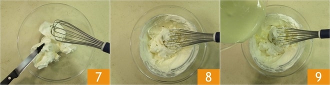 Gebt den Mascarpone in eine Schüssel, fügt die Samen der Vanilleschote hinzu 7 und rührt mit einem Schneebesen, um ihn geschmeidig zu machen 8. Fügt auch die Pâte à bombe hinzu und mischt erneut mit dem Schneebesen 9.