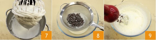 schlagen Sie weiter, bis das Baiser kalt ist 7. Filtrieren Sie den Kaffee aus der Sahne mit einem Sieb 8 und schlagen Sie sie mit einem elektrischen Schneebesen steif 9.