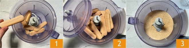Um die Tiramisu-Trüffel zuzubereiten, bereiten Sie zuerst den Kaffee zu und lassen ihn abkühlen, bis er Raumtemperatur erreicht hat. Geben Sie die Löffelbiskuits in den Behälter eines Mixers mit Klingen 1, verschließen Sie den Deckel 2 und zerkleinern Sie sie zu Pulver 3.
